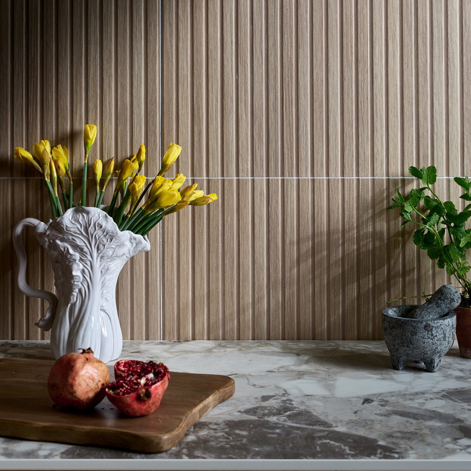 Creating the effect of slatted wood panelling, but hardy enough for use in any area, these tiles give an undeniable elegant linear feel.