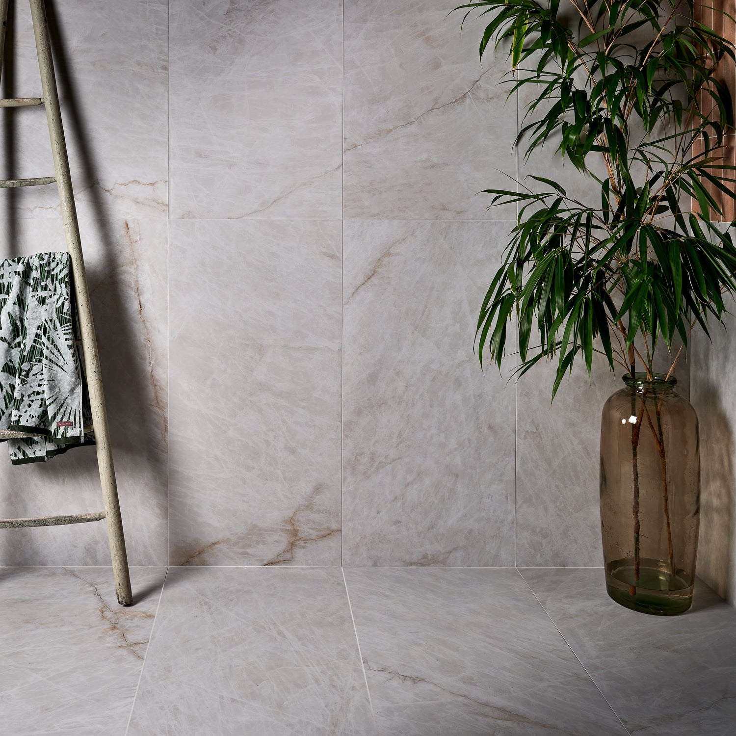 Crystal white effects are right on trend, and this beautiful tile, with its feathery white and gold veins criss-crossing an ivory background, will give a modern, yet classy feel to your space.