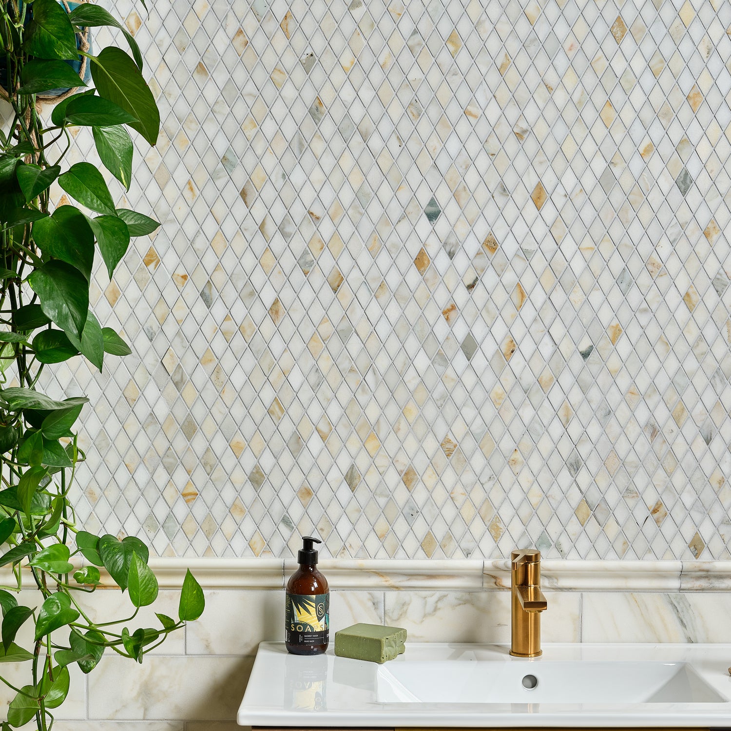With its antique white background, and gold and green highlights, this marble oozes luxury. We love to combine the mosaics, tiles and the moulding to create a traditional marble bathroom, or using the uniquely shaped mosaics to create elegant drama. This product is real marble and therefore sealing is required.