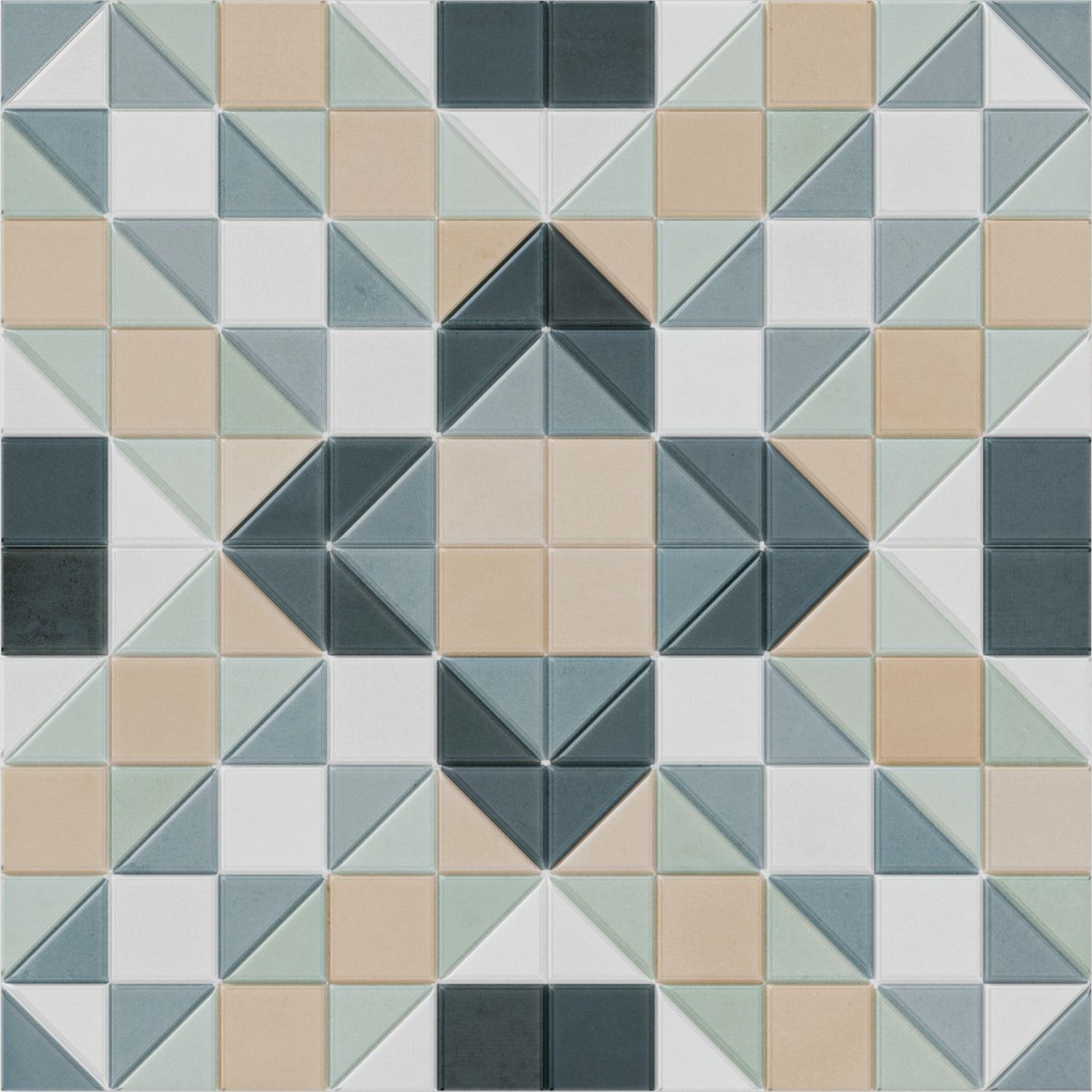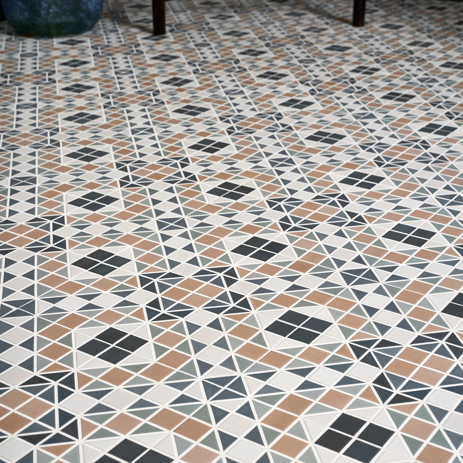 Reminding us of holidays in Victorian seaside towns, with bold and natural tones. These patterned tiles come with a cleverly pre-scored surface that, when grouted, resemble Victorian mosaic floors.