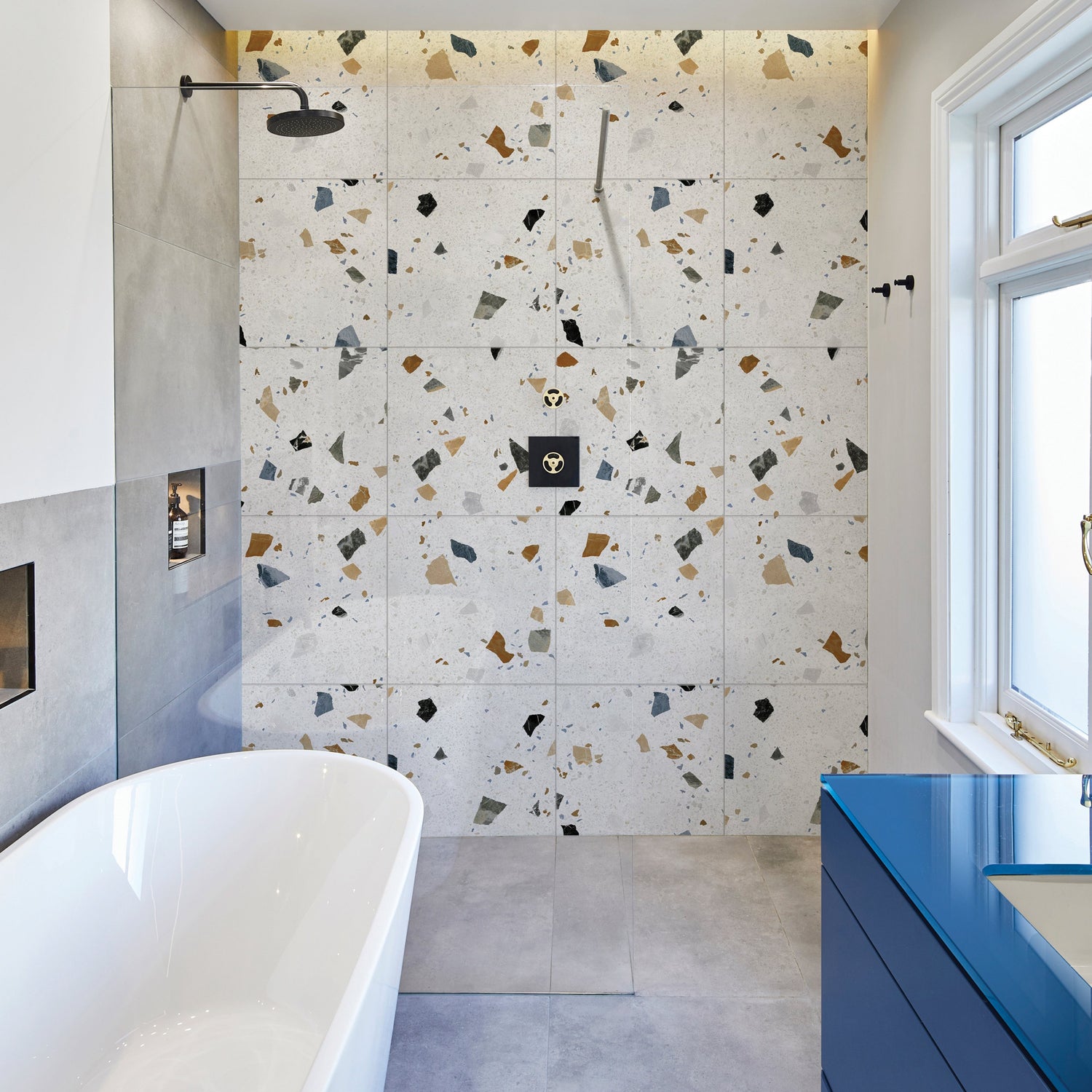 A contemporary take on real terrazzo and comes in four colour options Pearl, Graphite, Gris and Antricita. The vivid speckles pick up light beautifully, making them perfect for a feature wall or floor.