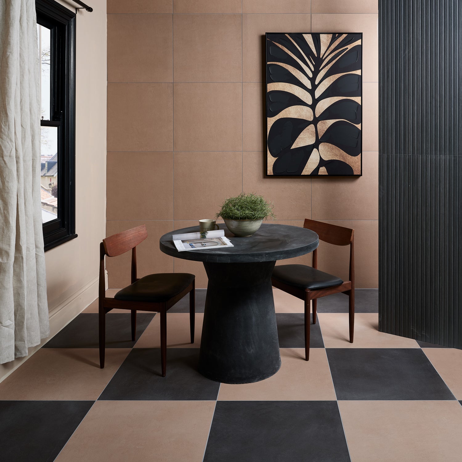 Plaster-effect walls are going nowhere so we’ve introducing a tile to give you that look for less with Stucco. A full-bodied porcelain tile. Their warm tones add to their velvety nature, and they’re great for colour-blocking. Works great as a chequerboard pattern with the Urban and other colours within the Stucco range.